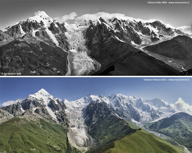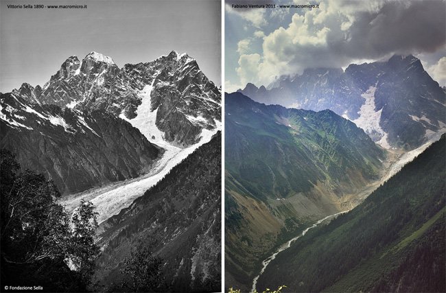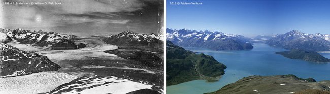 Este é o caso do fotógrafo italiano Fabiano Ventura, idealizador do projeto “Na trilha dos glaciares”, que põe em confronto imagens históricas de glaciares no Alasca, no Cáucaso e na cadeia do Karakorum (Ásia) com fotos contemporâneas feitas na mesma situação e nos mesmos pontos. Aqui vão algumas imagens comparativas que ele coletou e organizou:
