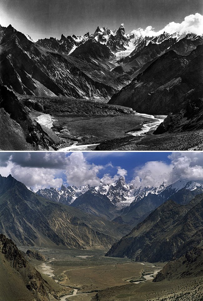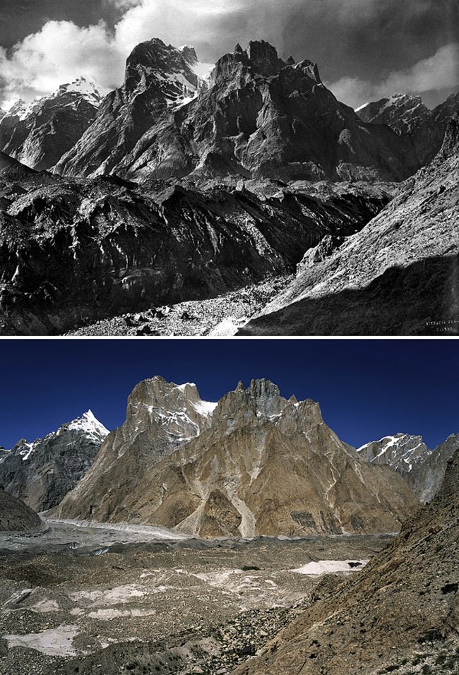 5 Visão das Torres de Trango, no Baltistã, Paquistão. As fotos foram feitas a partir do velho campo-base de Liligo. No confronto entre as duas fotografias, efetuadas no intervalo de 100 anos, fica bem evidente a perda de espessura do glaciar Baltoro estimada, nessas zonas centrais, em cerca de 50/60 metros.