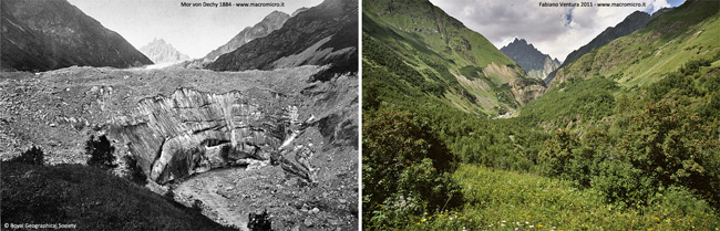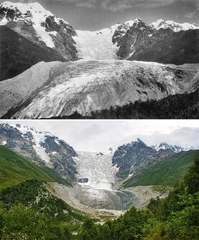 4 O glaciar Tvuiberi, no Cáucaso georgiano. As duas fotografias são separadas por 127 anos. No lugar onde outrora estava a frente do glaciar, ergue-se hoje uma densa floresta. Desde a pequena era glacial, que atingiu seu apogeu nesta região ao redor de 1810, até os dias de hoje, o Tvuiberi, que até 1965 era o maior glaciar do Cáucaso, apresentou a maior contração de superfície (-16,4 quilômetros quadrados, equivalentes a 34,9% da superfície original) e a retirada linear mais impressionante (-3,98 quilômetros, cerca de 42% do comprimento máximo ao longo da principal linha de fluxo).